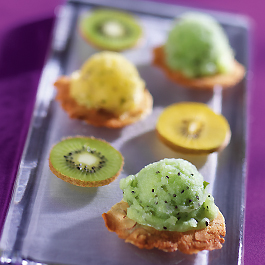 2. Heat water, sugar and corn syrup until sugar is dissolved. Remove from heat and cool. Stir pureed kiwifruit into sugar syrup mixture. Pour into ice cream maker and freeze following manufacturer's directions. 3. Serve garnished with fresh kiwifruit slices. Refreshing in its intensity, this sorbet has a delightful kiwifruit-lime flavor with fresh tarragon finish. Serve a small scoop on a thin wafer cookie as an unexpected intermezzo treat. For more recipes and kiwifruit information, please visit www.zesprikiwi.com Nutritional information: